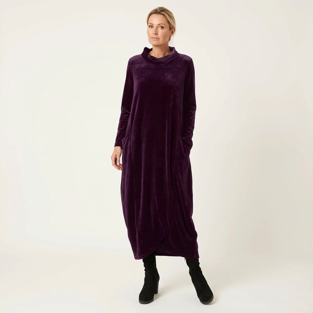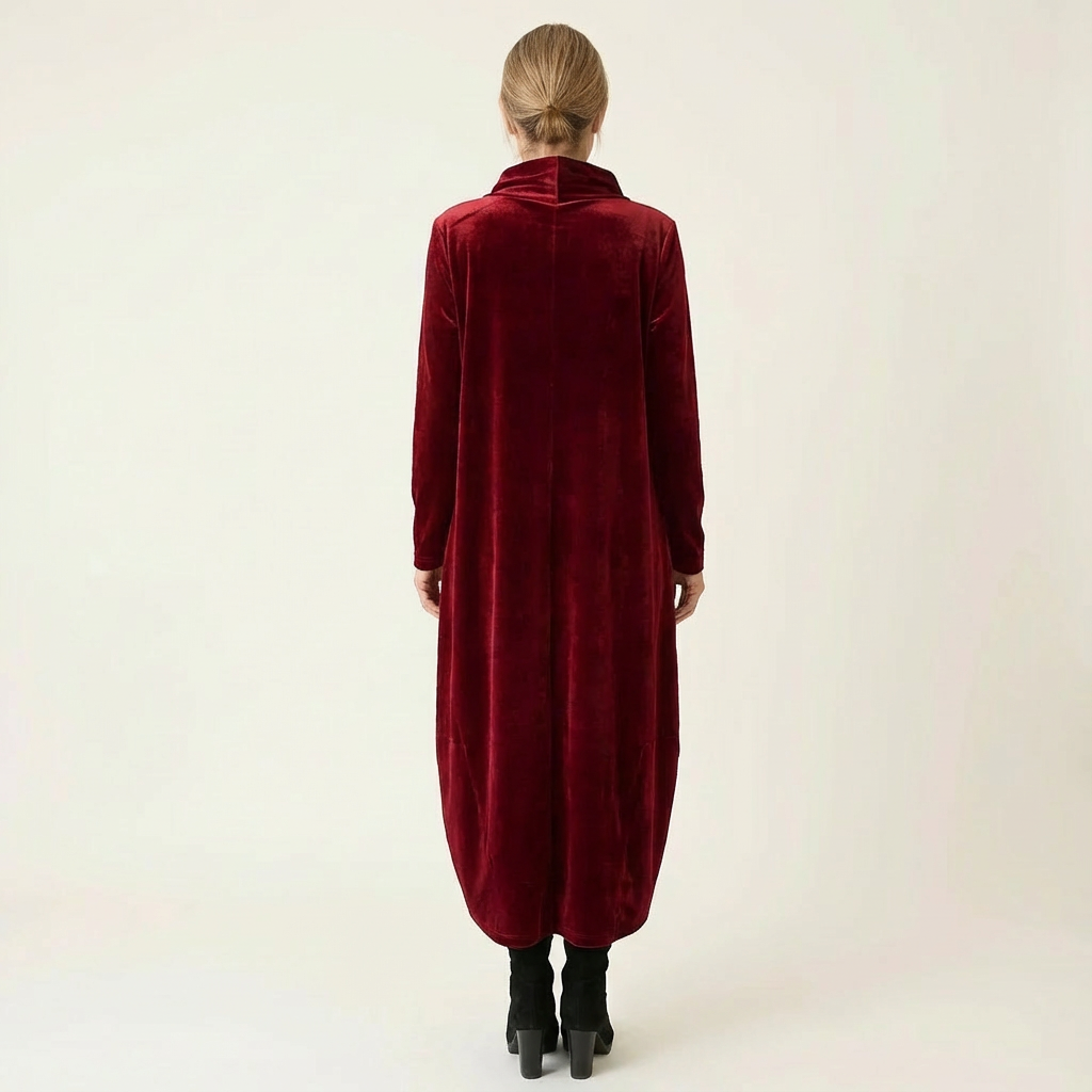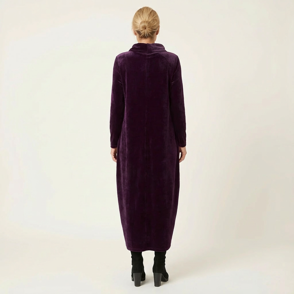The Arianna Dress is designed to celebrate your natural elegance while keeping you warm and comfortable through the colder months. Crafted from soft velour with a subtle sheen, it brings together coziness and refinement in a silhouette that feels both relaxed and elevated.