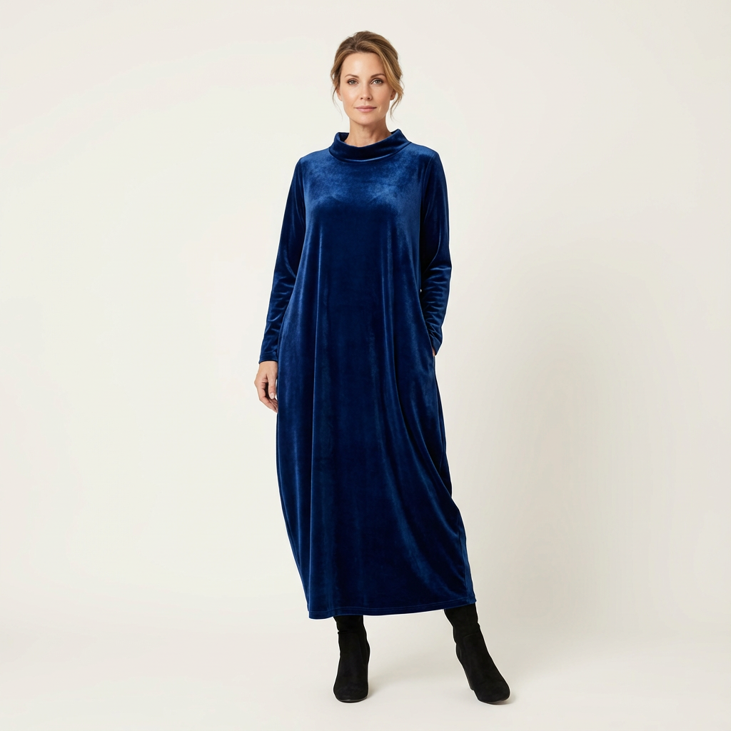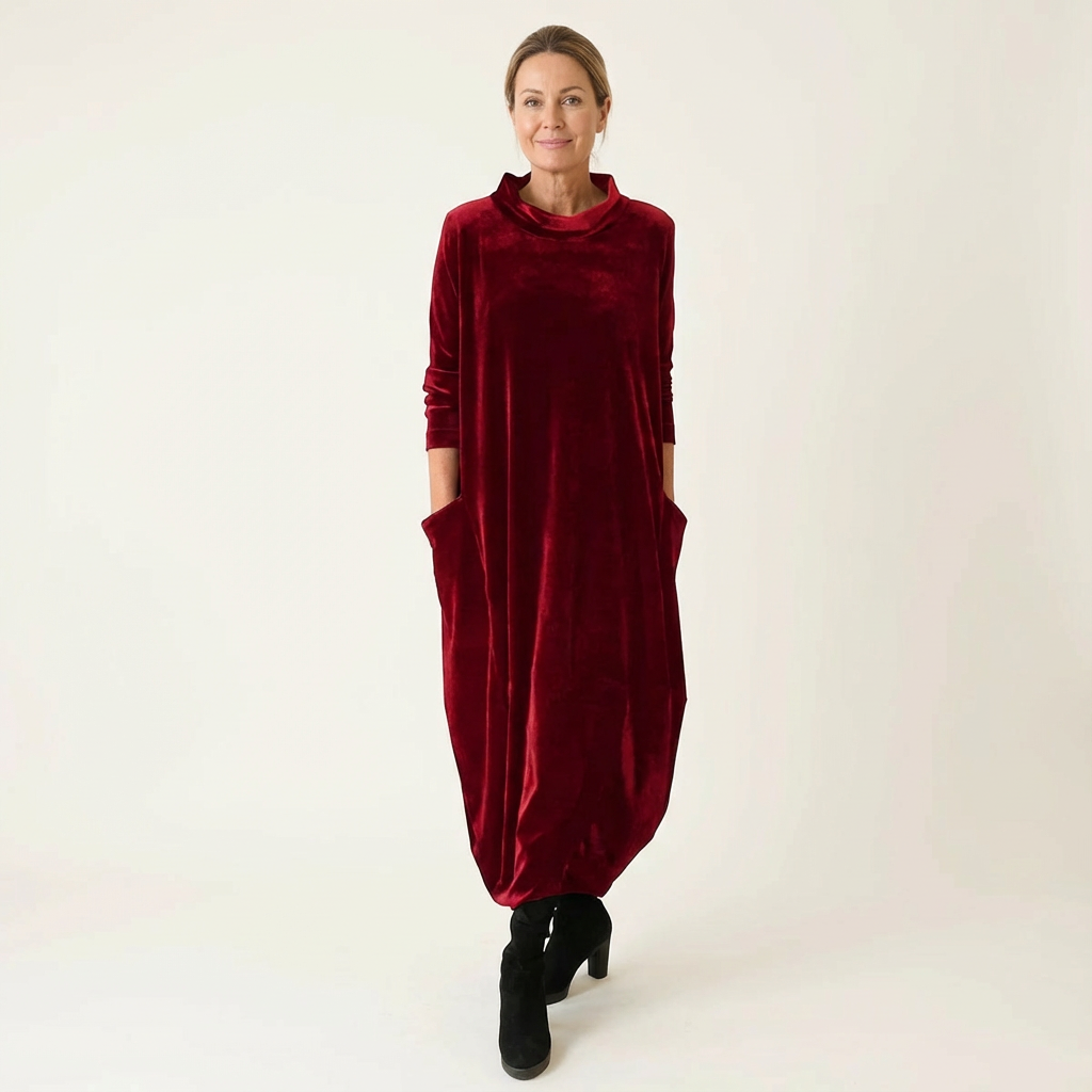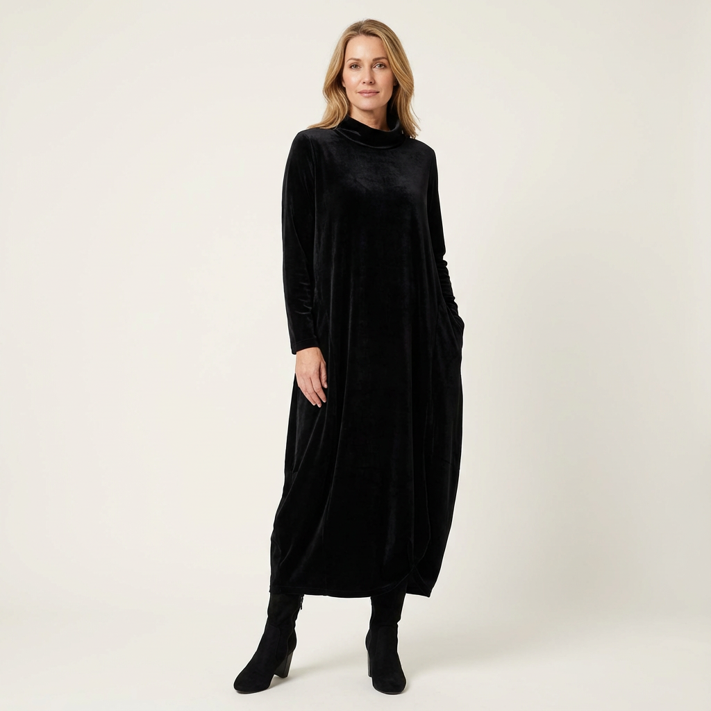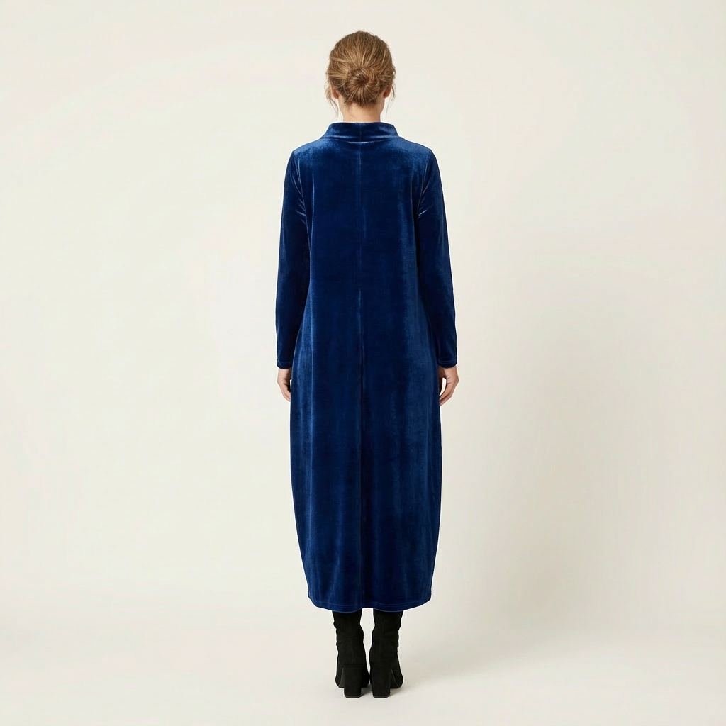 The Arianna Dress is designed to celebrate your natural elegance while keeping you warm and comfortable through the colder months. Crafted from soft velour with a subtle sheen, it brings together coziness and refinement in a silhouette that feels both relaxed and elevated.