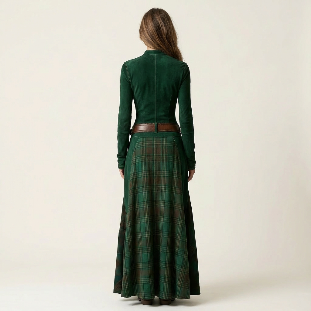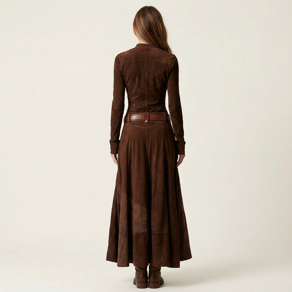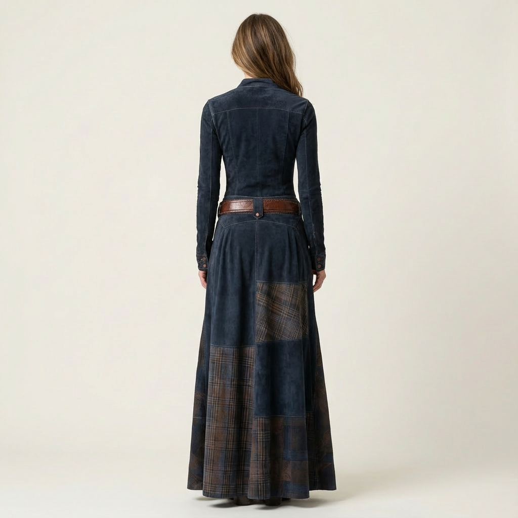 The Leonie Maxi Dress blends vintage sophistication with a touch of Western-inspired charm, creating a piece that feels both timeless and distinctly modern. Crafted in a deep navy suede-blend and complemented by flowing plaid panels, this dress brings texture, movement, and elegance together in a way that feels effortlessly elevated.