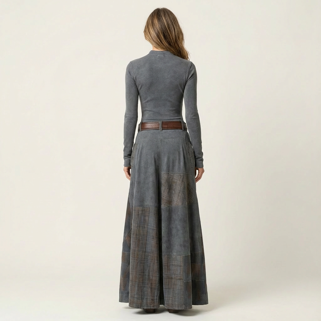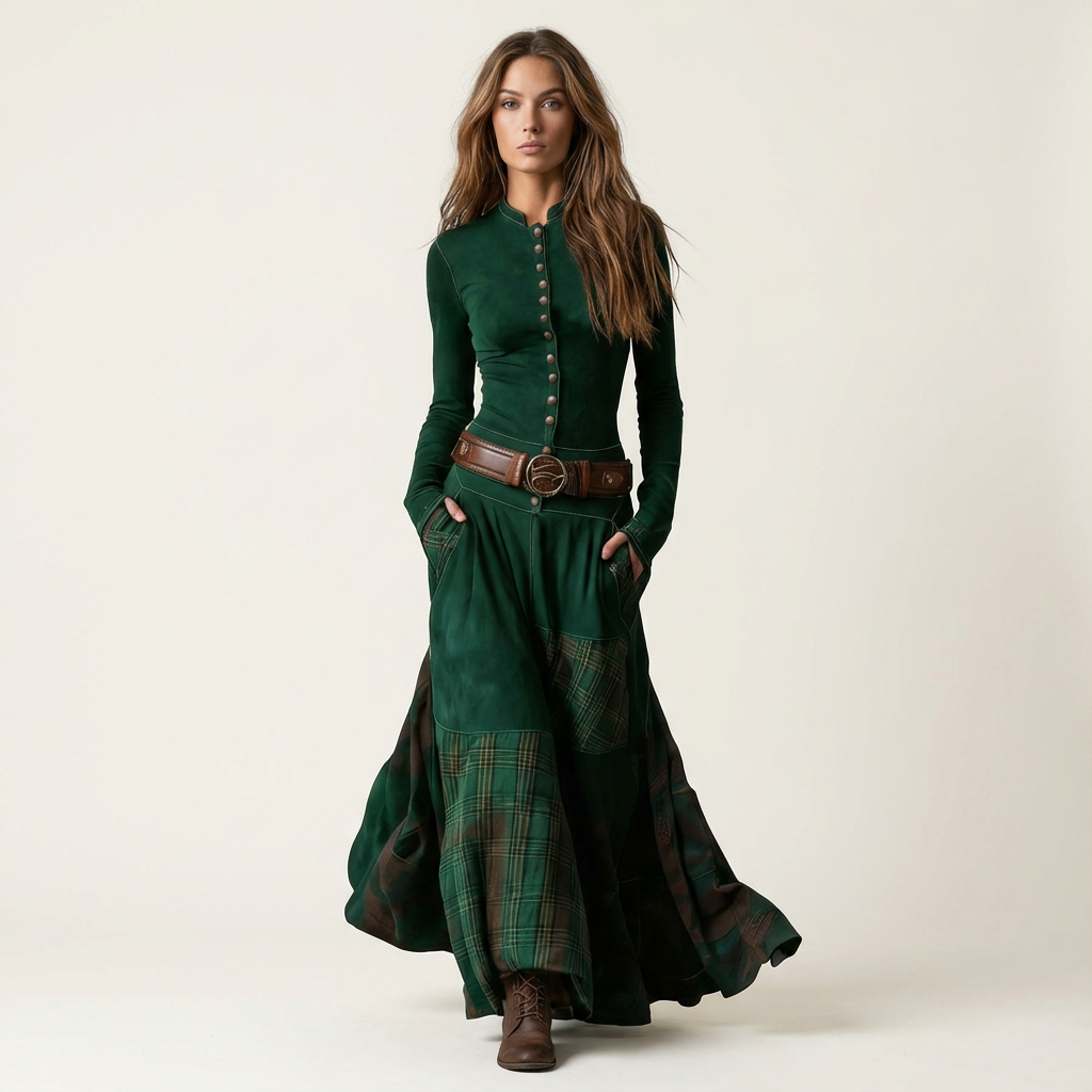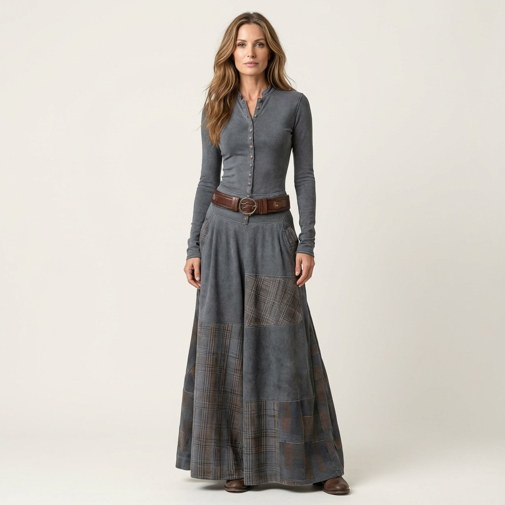 The Leonie Maxi Dress blends vintage sophistication with a touch of Western-inspired charm, creating a piece that feels both timeless and distinctly modern. Crafted in a deep navy suede-blend and complemented by flowing plaid panels, this dress brings texture, movement, and elegance together in a way that feels effortlessly elevated.